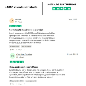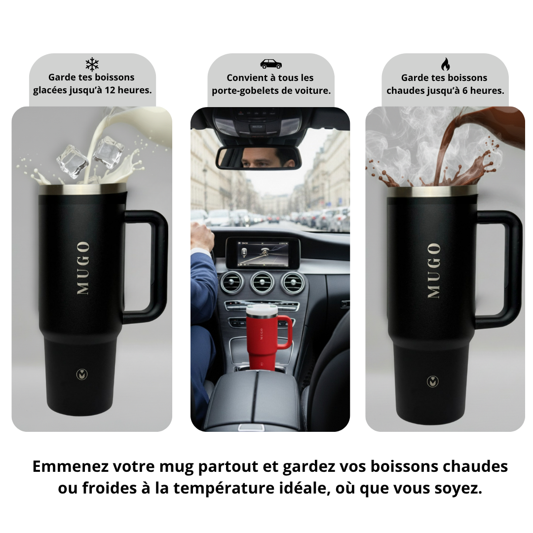 Je suis ravie ! Le MUGO rentre parfaitement dans le porte-gobelet de ma voiture, c’est super pratique pour mes trajets du matin. Il ne bouge pas, garde mon café chaud-70% • Expédition rapide • Retours faciles
