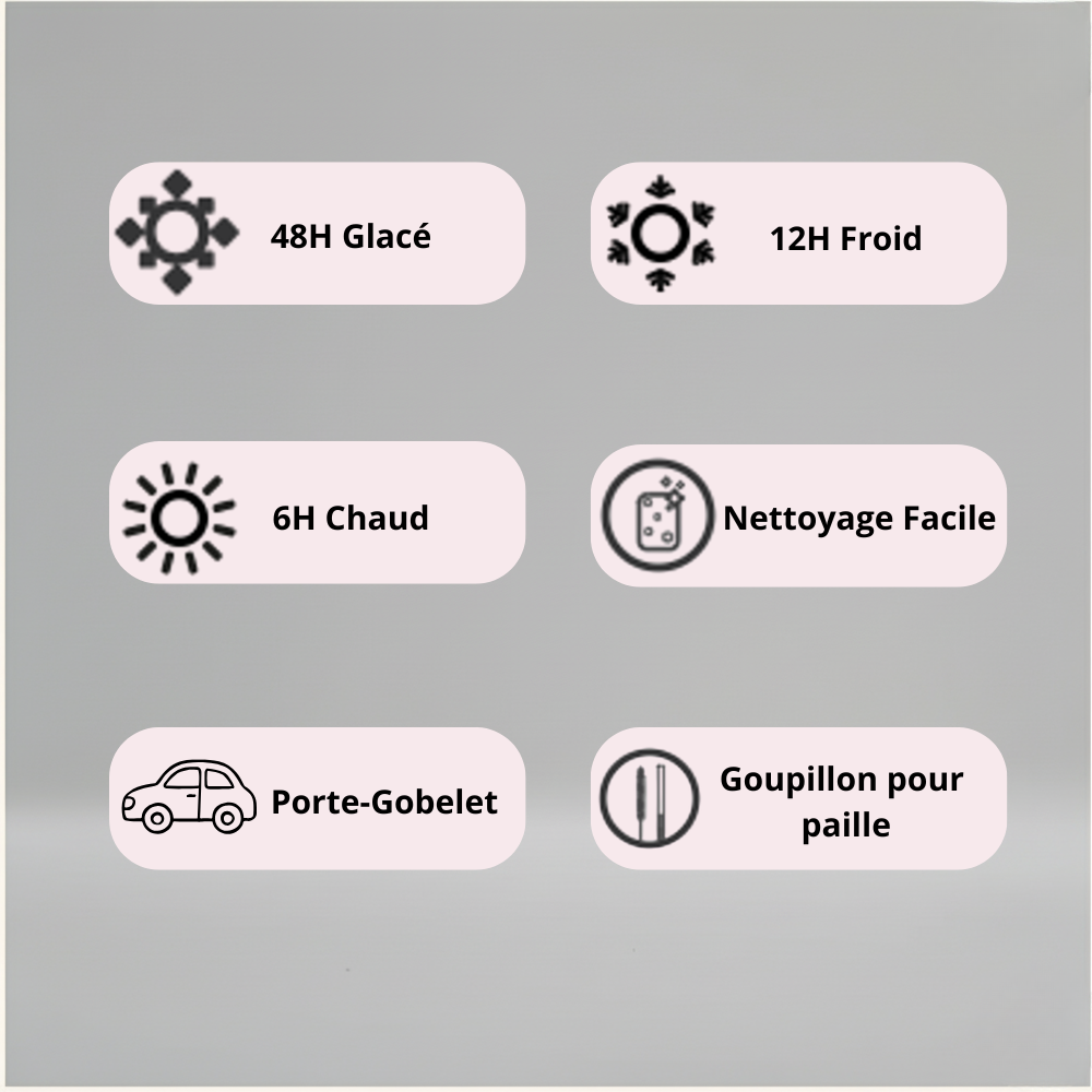 Jusqu’à 6 h pour le chaud et 12 h pour le froid, grâce à la double paroi en acier inoxydable.